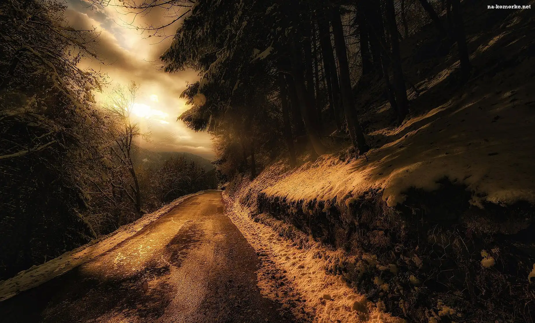 Zachód, Zima, Śnieg, Słońca, Droga, Skarpa, Drzewa na Komórkę