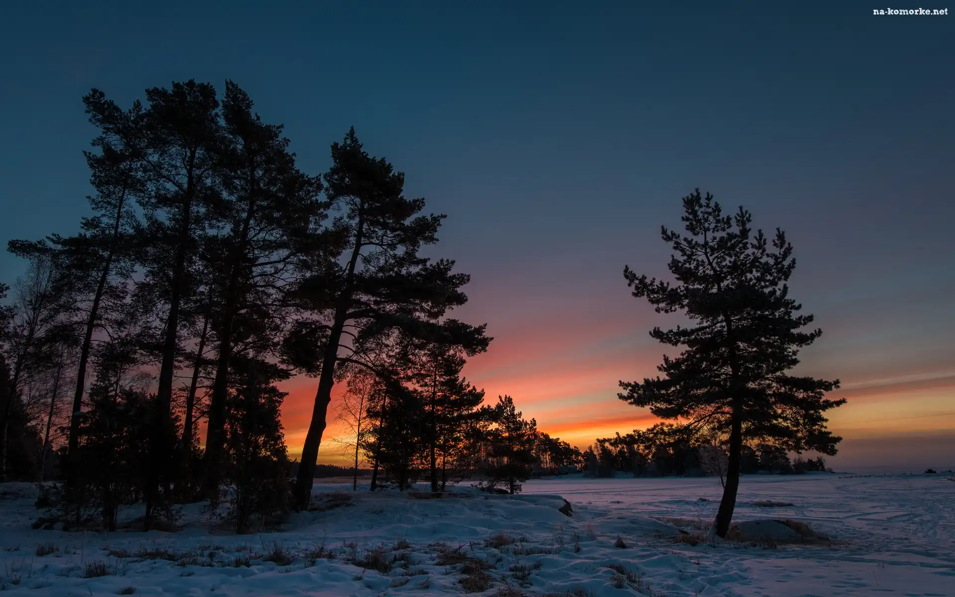 Zima, Pola, Drzewa, Zachód, Słońca na Komórkę