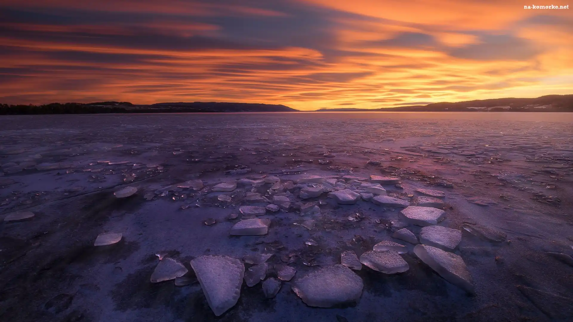 Zima, Jezioro, Lód, Zachód słońca na Komórkę