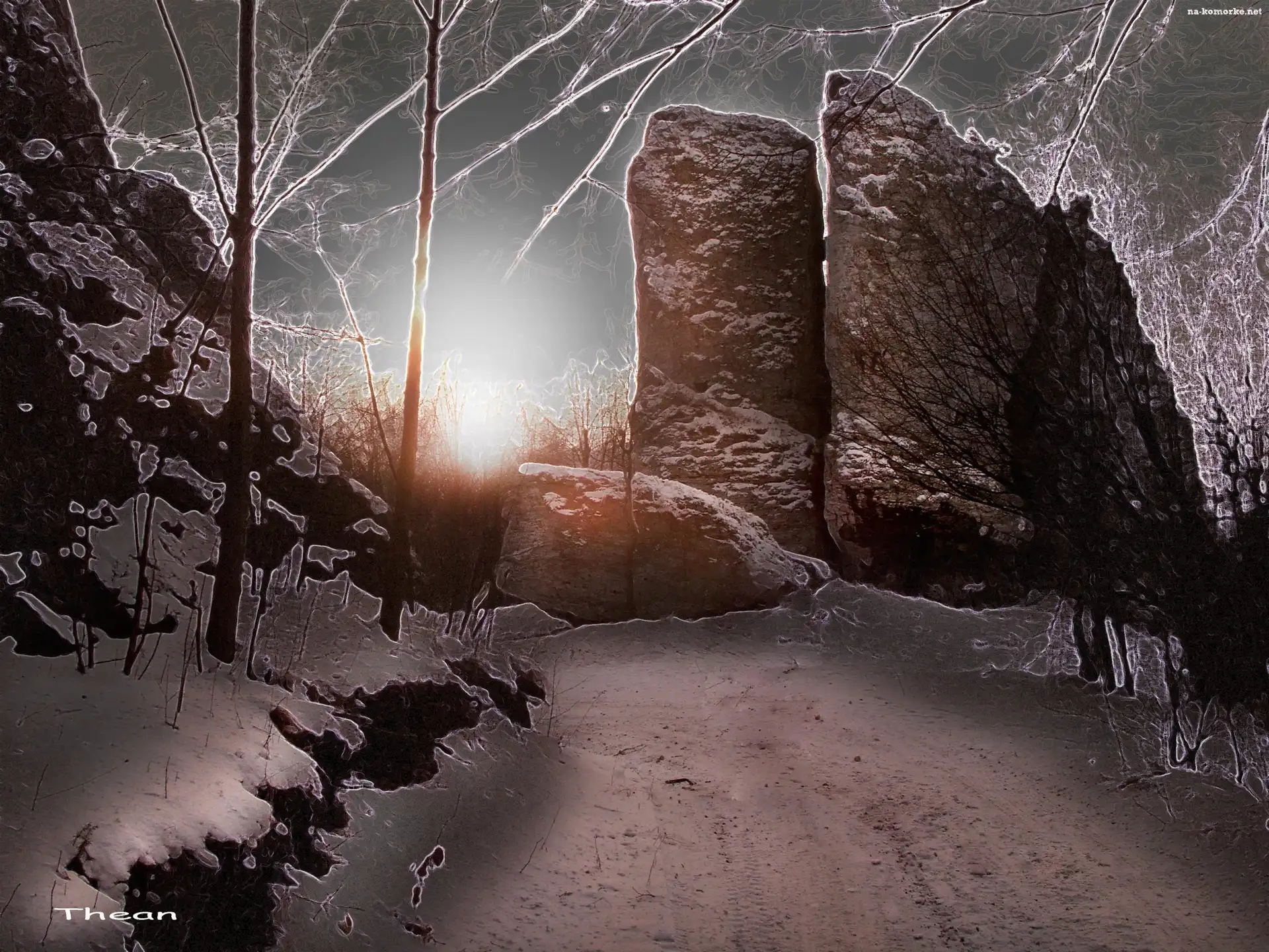 Zimowy, Śnieg, Widok, Skały na Komórkę