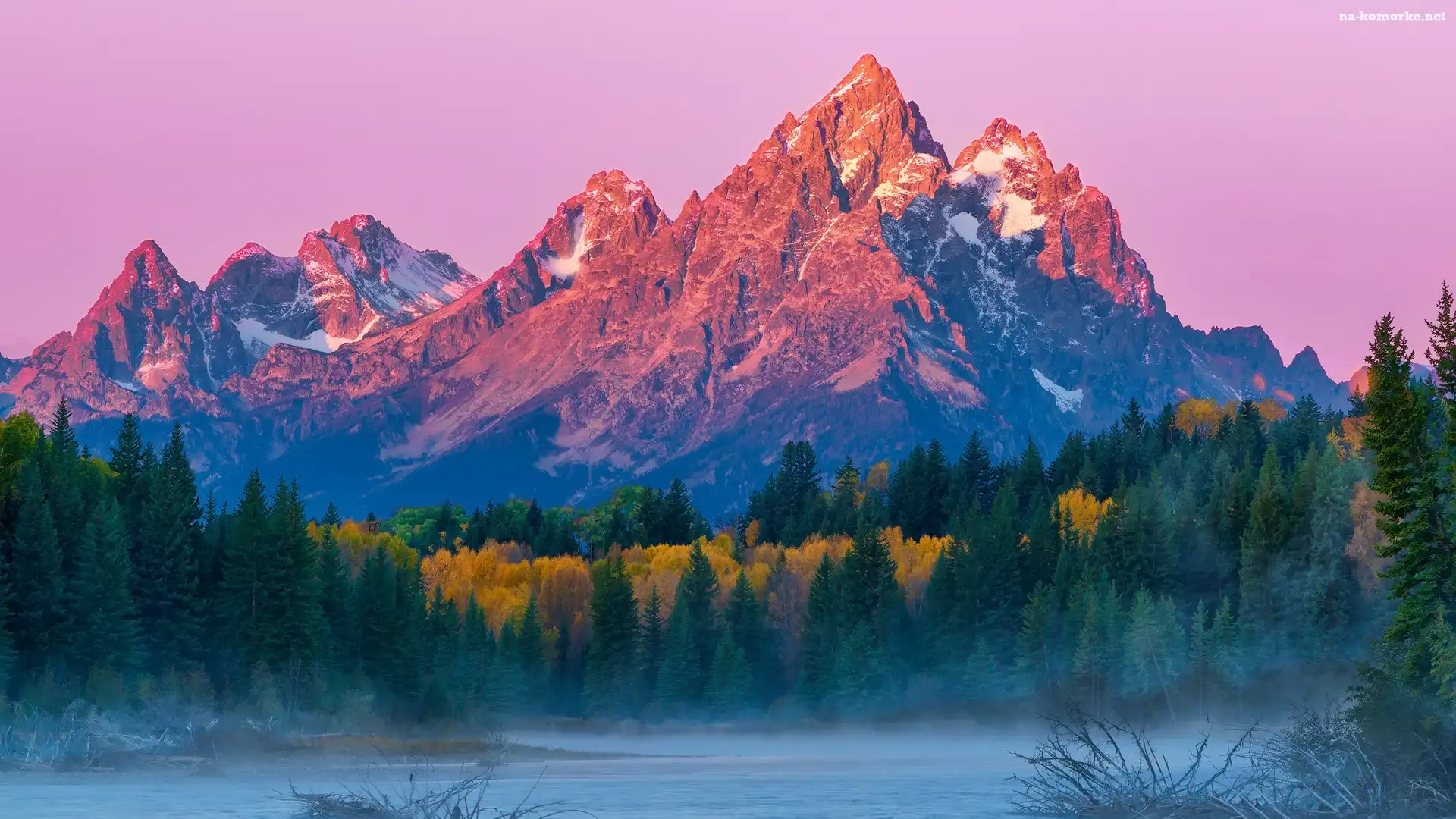 Park Narodowy Grand Teton, Drzewa, Teton Range, Stany Zjednoczone, Rzeka, Jesień, Góry, Stan Wyoming na Komórkę |