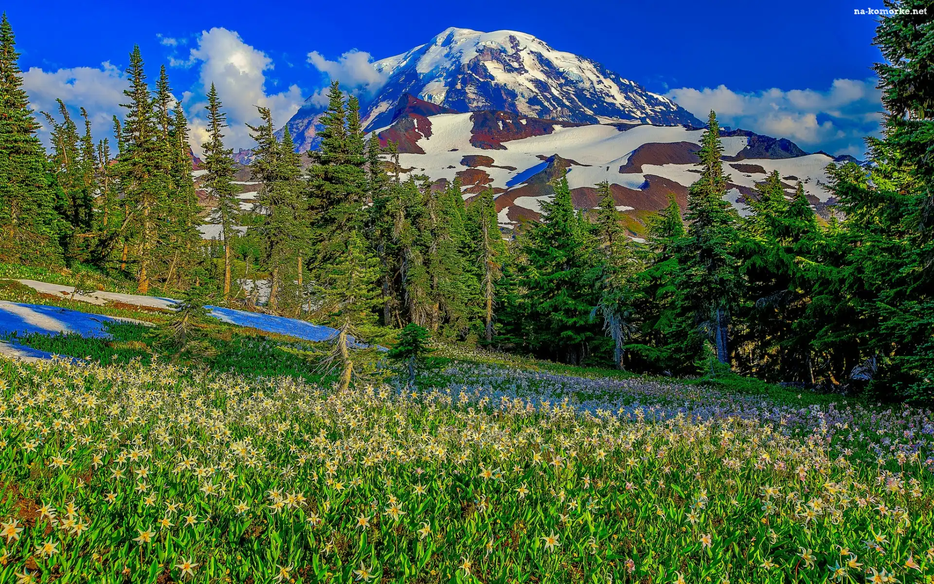Góry, Stan Waszyngton, Stany Zjednoczone, Łąka, Drzewa, Stratowulkan Mount Rainier, Park Narodowy Mount Rainier na Komórkę |
