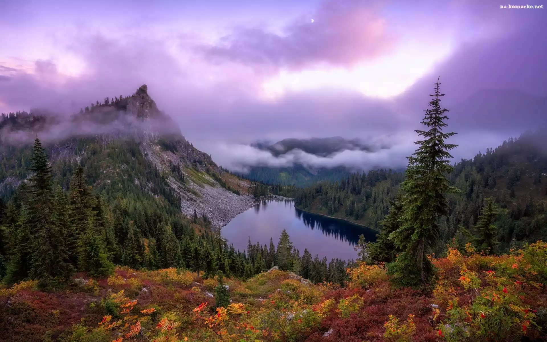 Chmury, Zieleń, Stany Zjednoczone, Drzewa, Góry Kaskadowe, Lake Valhalla, Jezioro, Mgła, Stan Waszyngton na Komórkę |