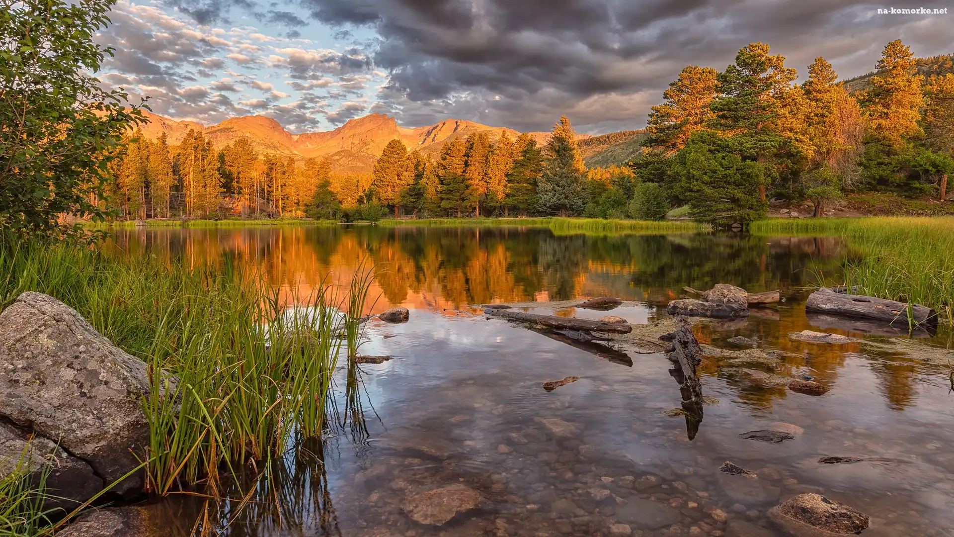 Park Narodowy Gór Skalistych, Kamienie, Spraque Lake, Stany Zjednoczone, Drzewa, Wschód słońca, Jezioro, Kolorado na Komórkę |