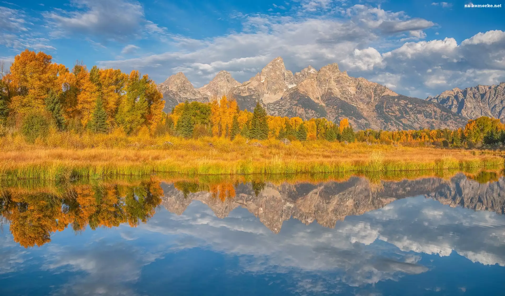 Stan Wyoming, Chmury, Rzeka, Jesień, Snake River, Park Narodowy Grand Teton, Teton Range, Drzewa, Góry, Stany Zjednoczone na Komórkę |