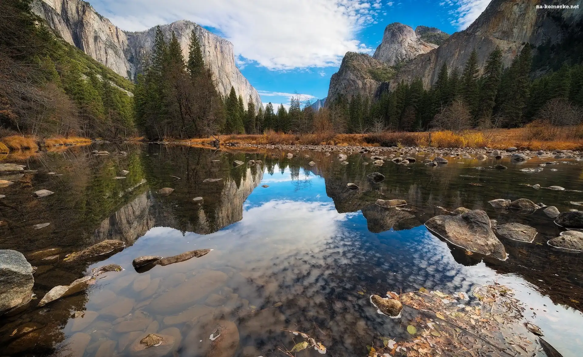 Park Narodowy Yosemite, Stany Zjednoczone, Góry, Dolina Valley, Chmury, Stan Kalifornia, Odbicie, Drzewa, Kamienie na Komórkę |