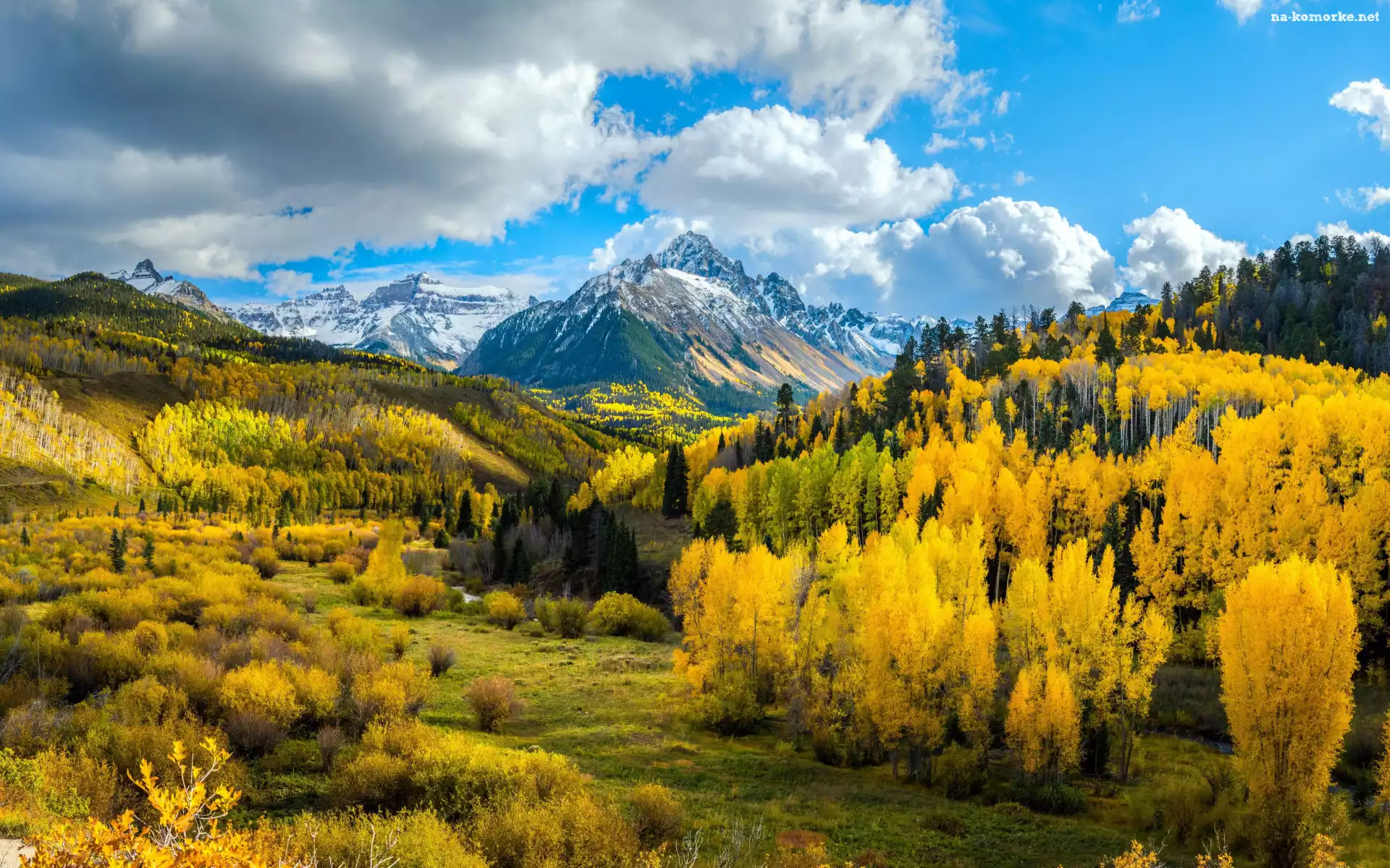 Drzewa, Góry Skaliste, Chmury, Mount Sneffels, Szczyt, Kolorado, Stany Zjednoczone, Lasy, Jesień na Komórkę |