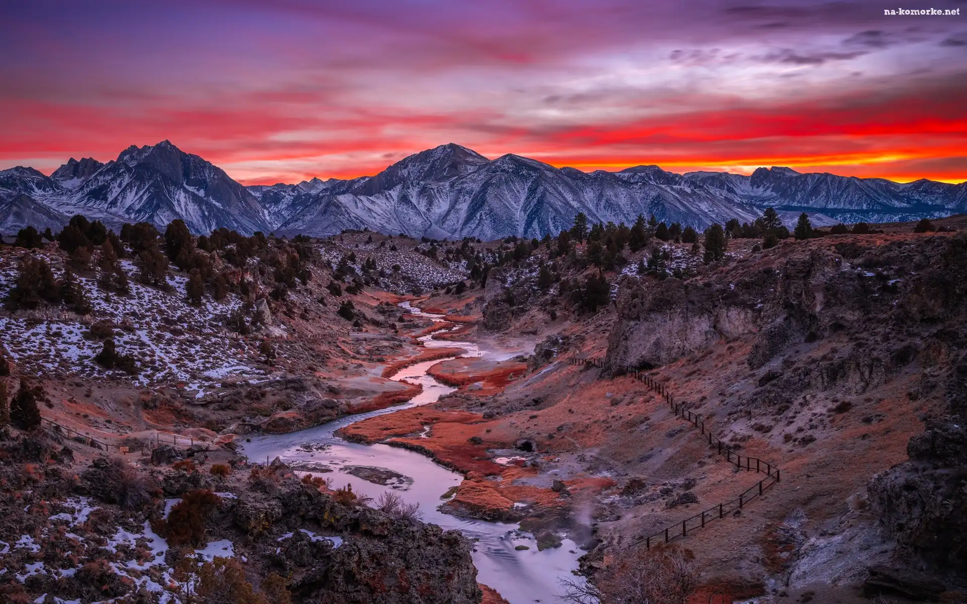 Stany Zjednoczone, Góry, Miejscowość Mammoth Lakes, Kalifornia, Zachód słońca, Rzeka, Lasy państwowe, Hrabstwo Mono, Inyo National Forest, Dolina, Hot Creek na Komórkę |