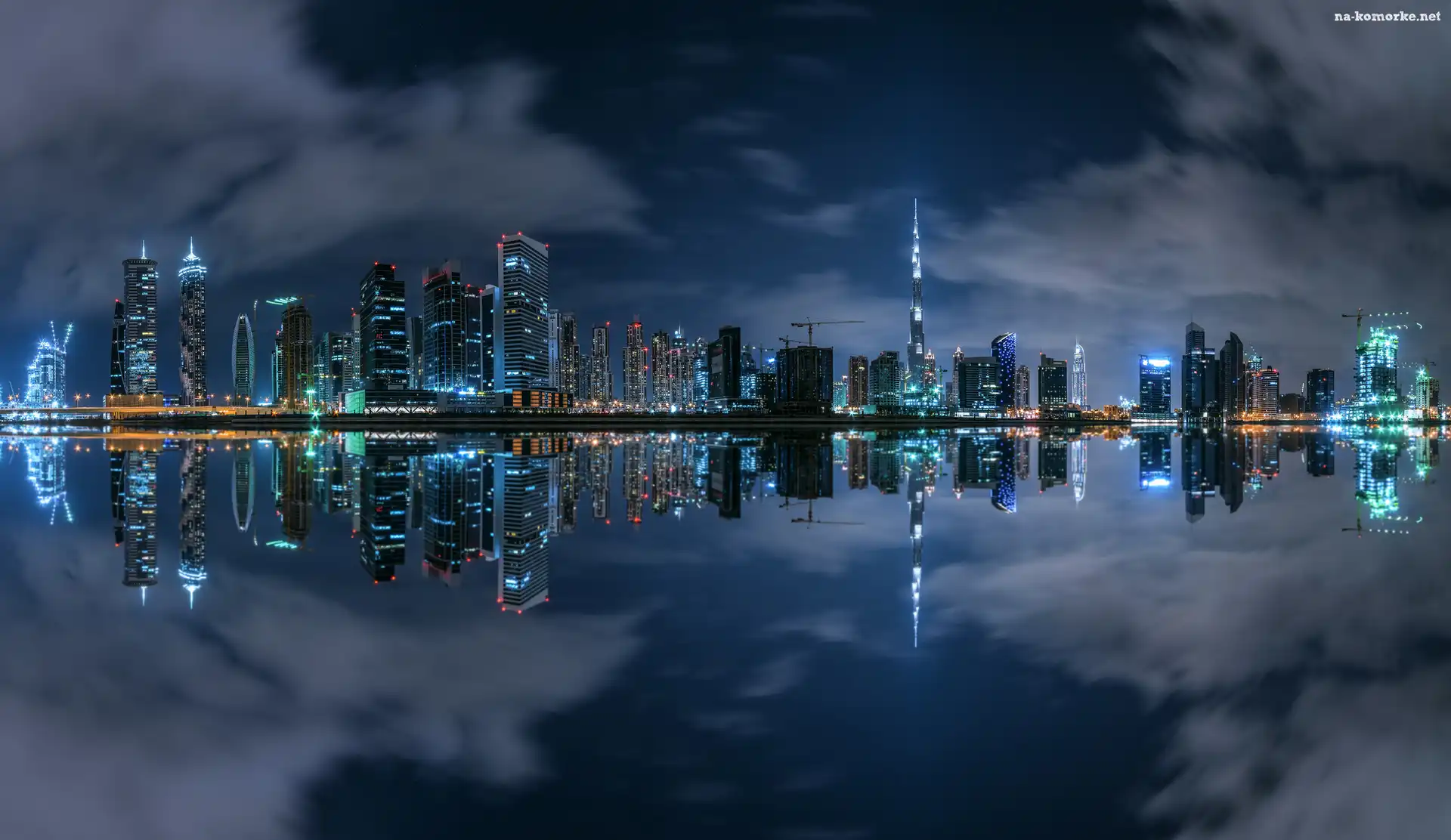 Zjednoczone Emiraty Arabskie, Woda, Dzielnica Business Bay, Odbicie, Dubaj, Miasto nocą, Wieżowce, Zatoka na Komórkę |
