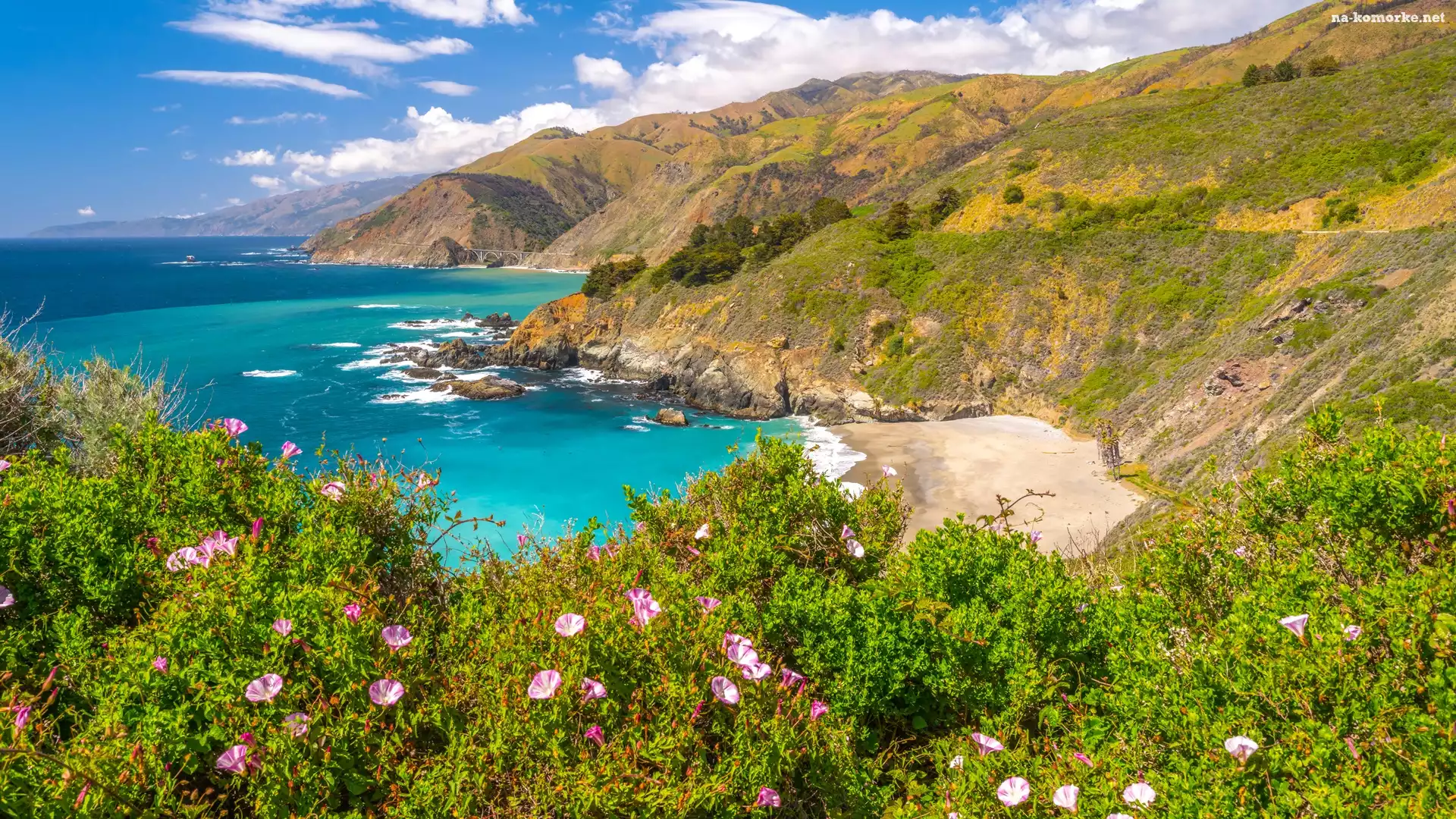 Wybrzeże, Morze, Chmury, Plaża, Stany Zjednoczone, Góry, Kalifornia, Kwiaty, Region Big Sur na Komórkę |