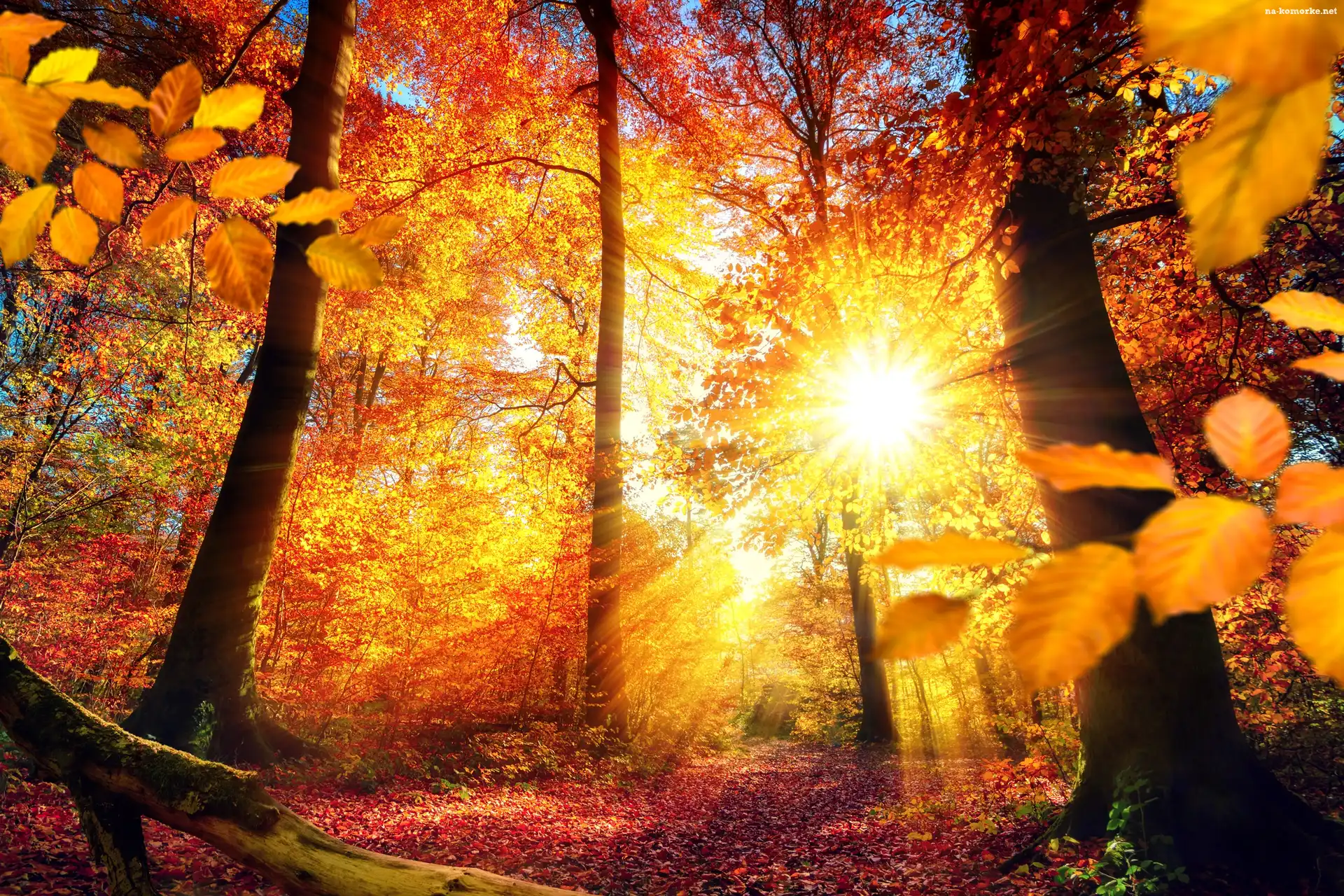 Złota, Promienie słońca, Jesień, Las na Komórkę