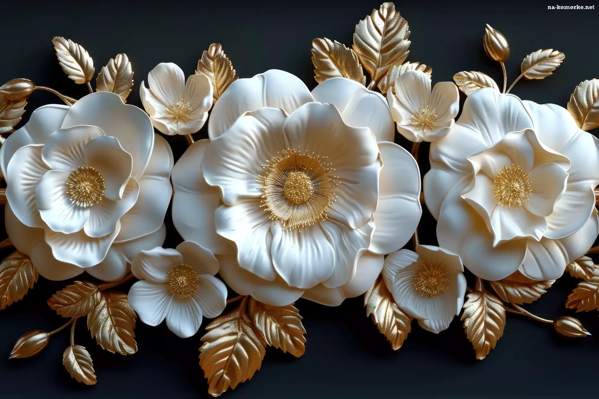 Białe, Złote, Listki, Kwiaty, Grafika na Komórkę