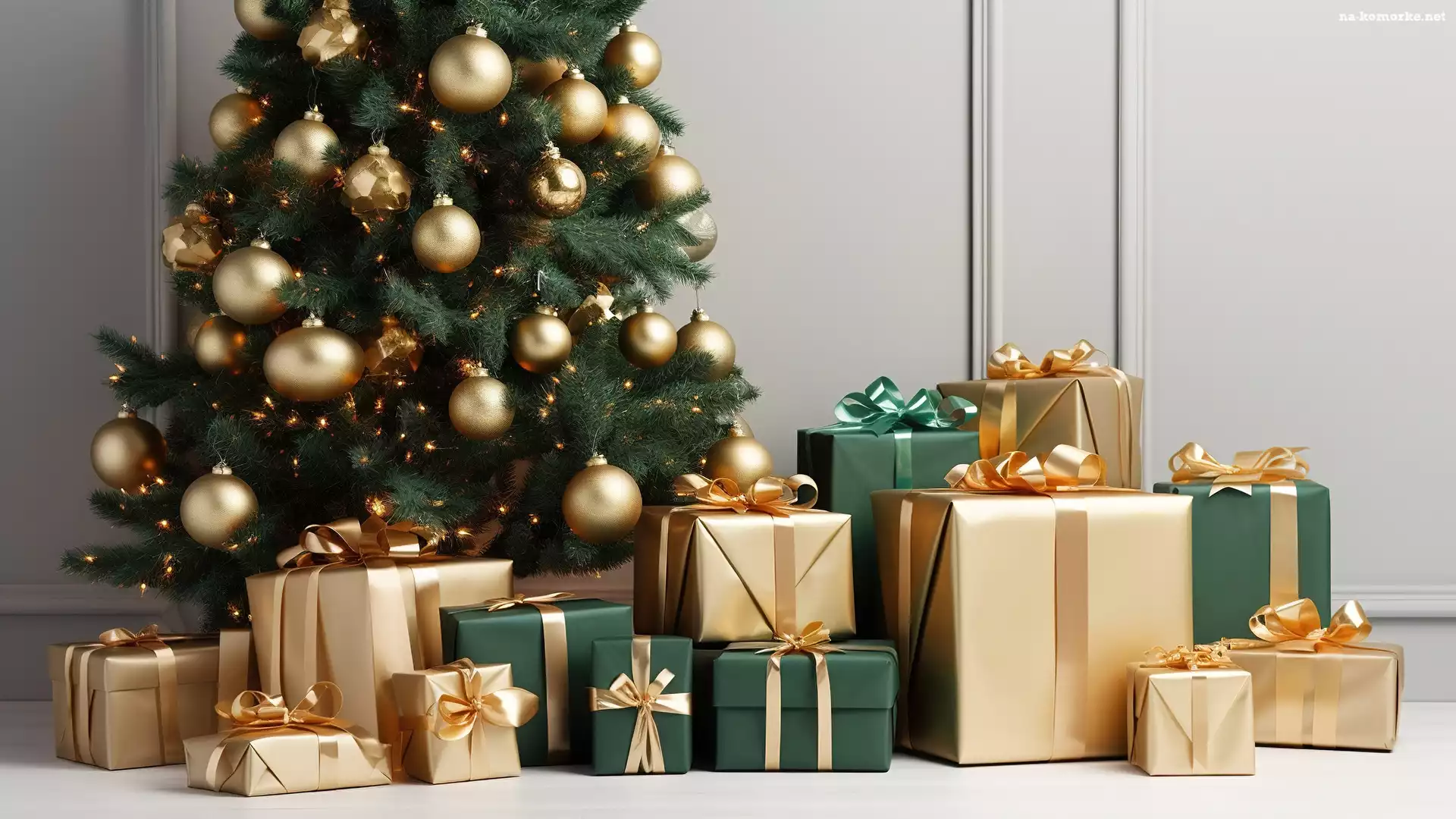 Bombki, Boże Narodzenie, Złote, Prezenty, Światełka, Choinka na Komórkę