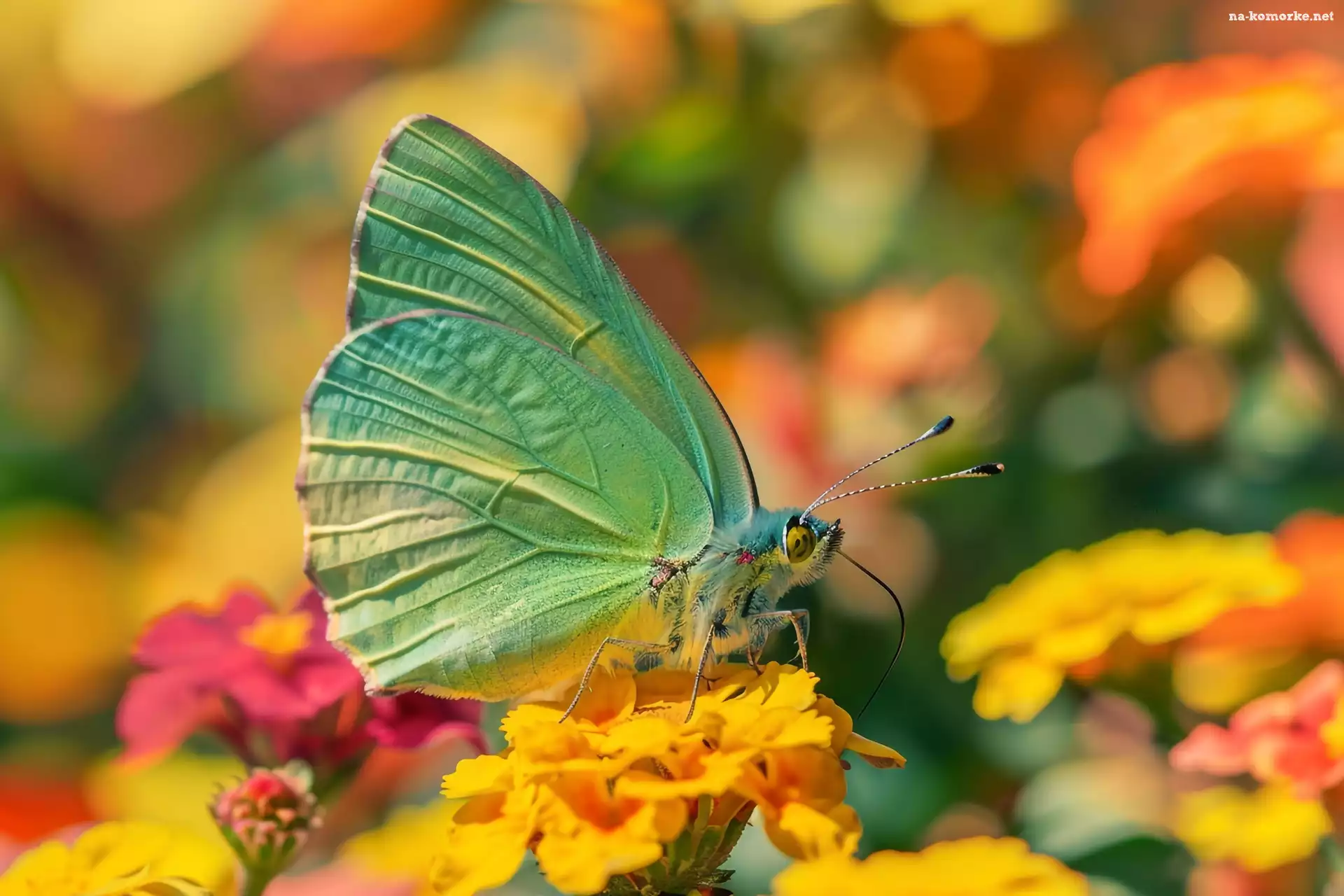 Zielony, Żółte, Kwiaty, Motyl, Grafika na Komórkę