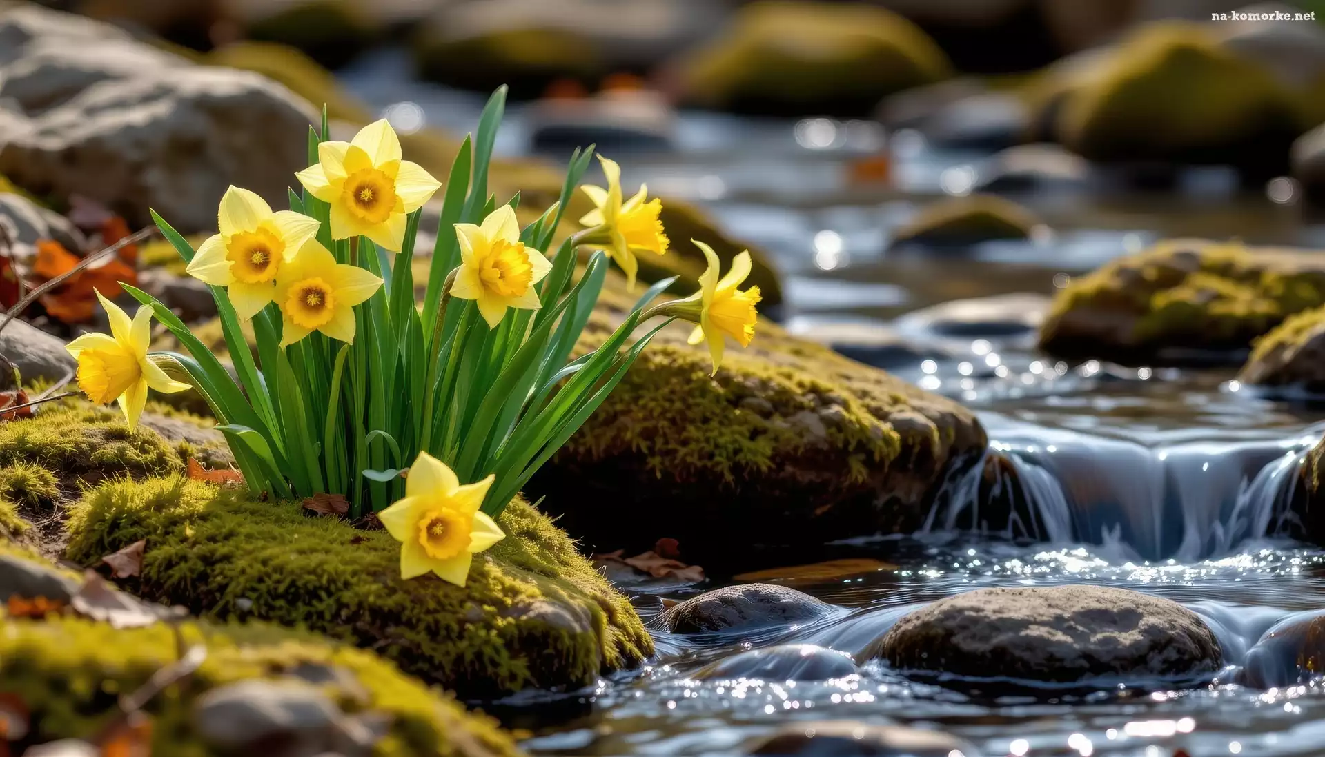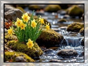 Kamienie, Strumień, Kwiaty, Wiosna, Narcyzy-żonkile, Omszałe, Żółte na Komórkę