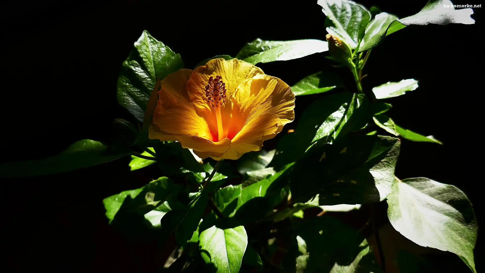 Kwiat, Hibiskus, Liście, Żółty, Czarne tło na Komórkę
