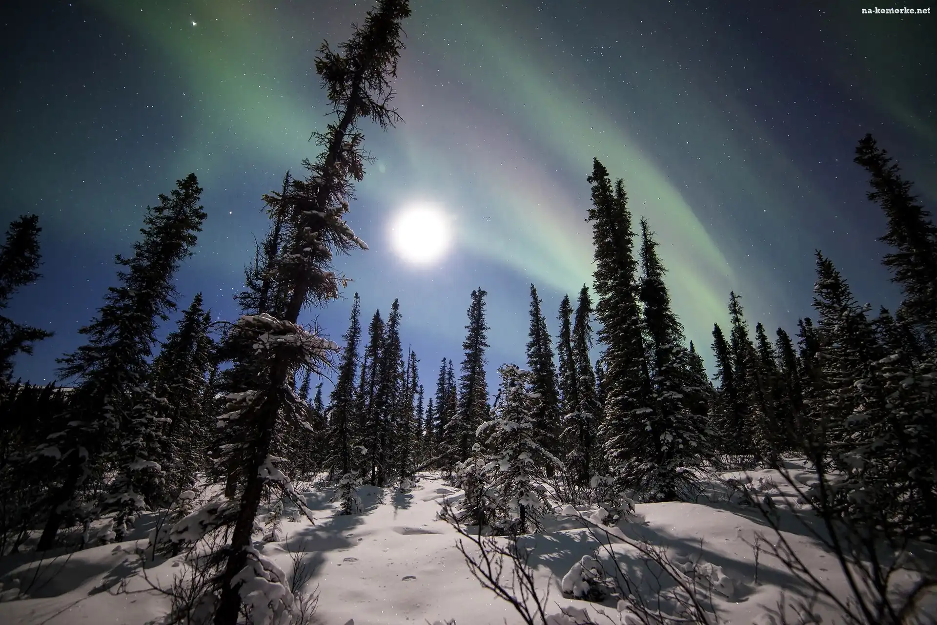 Zorza, Wzgórza, Zima, Śnieg, Drzewa, Polarna na Komórkę