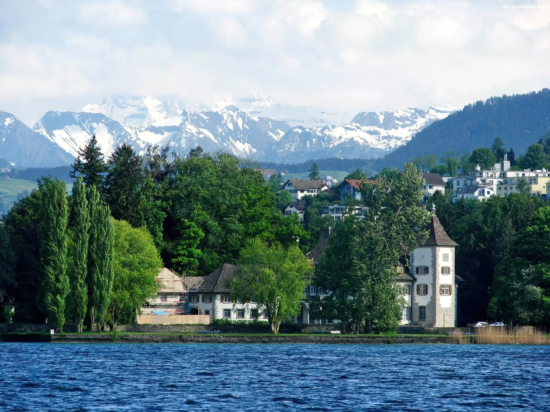 Góry, Drzewa, Domy, Szwajcaria, Rzeka, Zurych na Komórkę