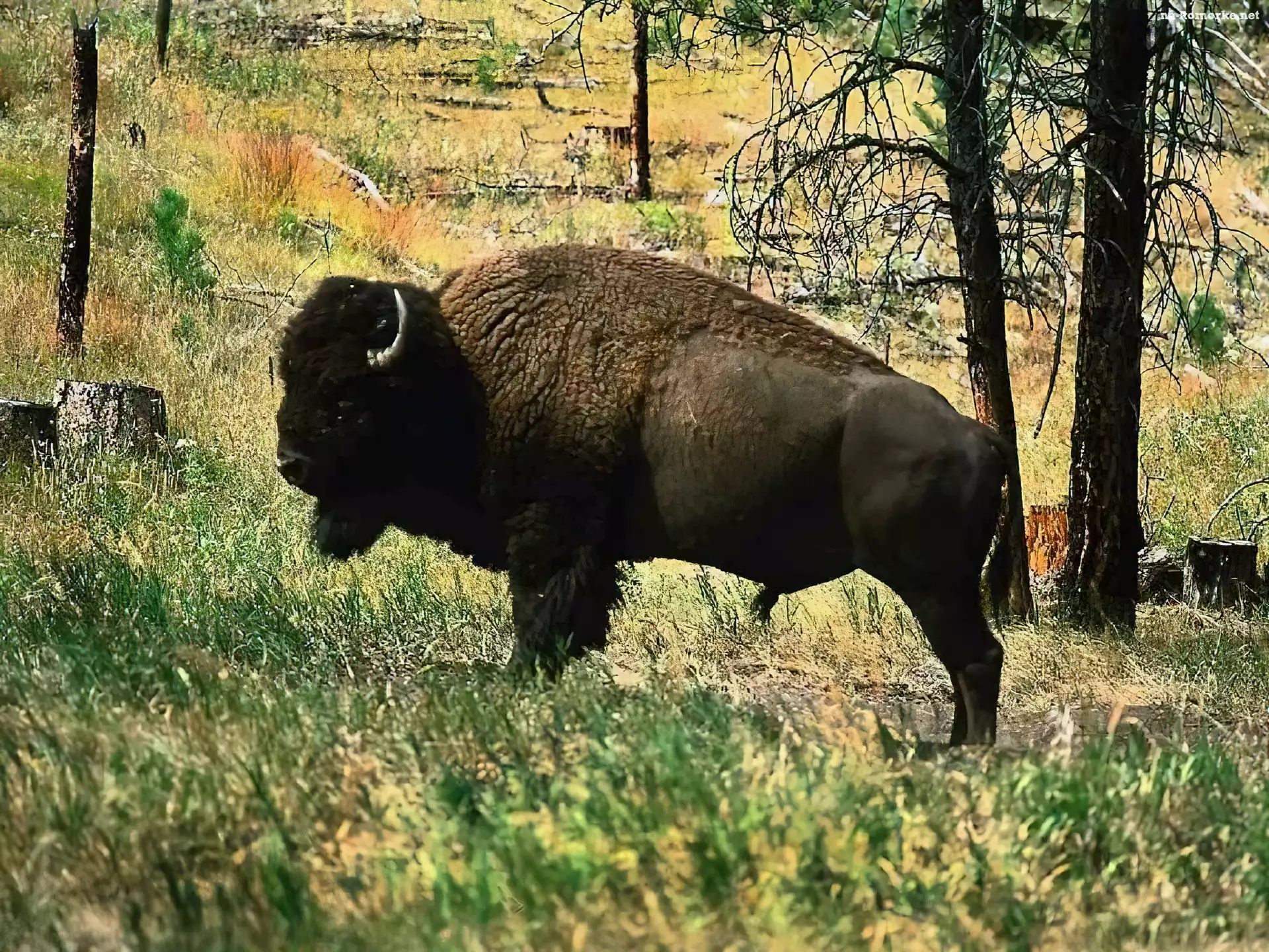 Głowa, Żubra Żubry, drzewa Zima, Śnieg, Żubr Mama, Żubr Zwierze, Polana, Żubr, Las Żubrza, Rodzina, Śnieg Pomnik, Żubra Żubr, trawa, kamienie